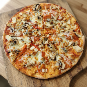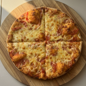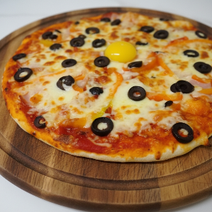 Салями, ветчина, томат, перец, сыр, соус, яйцо, маслины