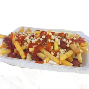 Кортофель фри (150гр )колбаска датская 2шт ,сыр моцарелла,лук фри ,соус на выбор.