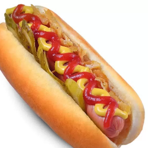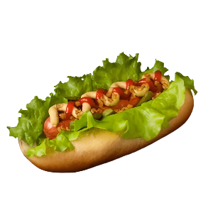 Булочка, сосиска, огурец, томат, салатный лист, кетчуп, горчица, острый соус