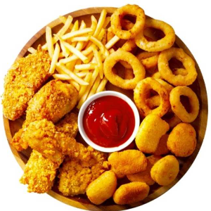 Наггетсы, картофель фри, куриные крылышки, луковые кольца, соусы