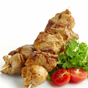 Шашлык, томат, огурец, лук, хлеб, фирменный соус