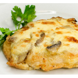 Филе птицы, шампиньоны, чесночный соус, сыр