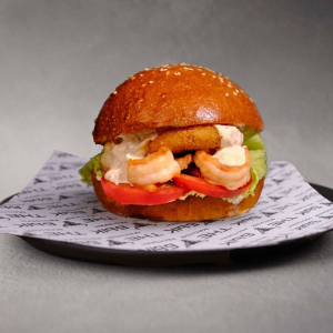 Булочка XXL, помидор, огурец, сыр, креветки, салат айсберг, соус цезарь