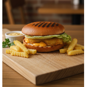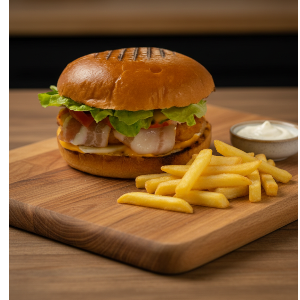Булочка XXL,куриная котлета,ломтик бекона,маринованный огурец,томат,салат айсберг,сыр,хрустящий лук фри,фирменный соус