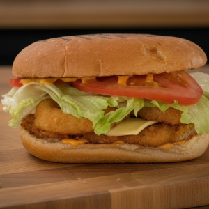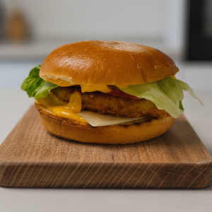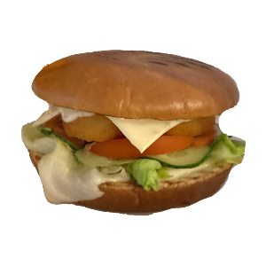 Булочка XXL,куриное филе,томат,салат айсберг,маринованный огурец,сыр,фирменный соус