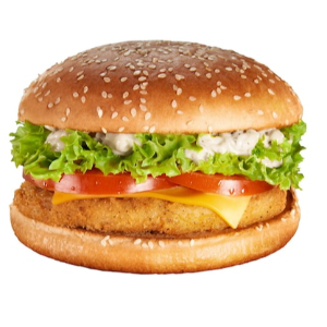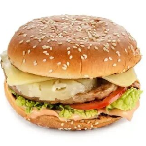 Булочка, куриная котлета, соус, салат, помидор, двойной сыр, маринованные огурчики, луковые кольца