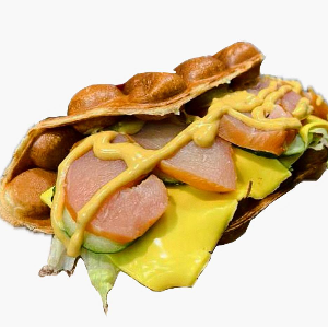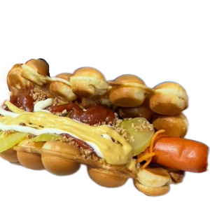Классическая вафля, морковка по-корейски, маринованный огурец, охотничья колбаска, лук фри, кетчуп, горчица