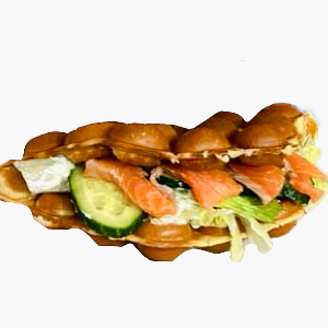 Классическая вафля,творожный сыр,листья салата,огурец,рыба