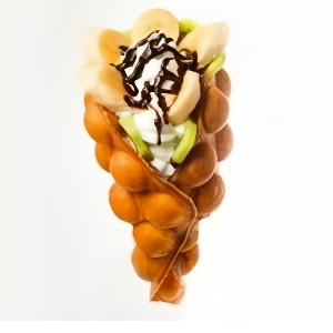 Ванильная вафля, ананас-маракуйя сливочное мороженое, банан, кокосовая стружка топпинг манго