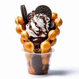 Вафля, сливочное мороженое, шоколадная паста, печенье орео, топпинг молочный шоколад