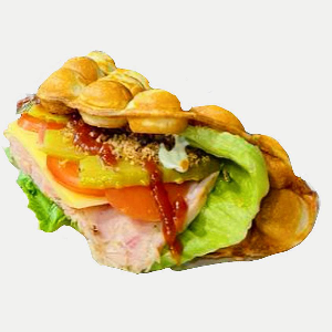 Классическая вафля, листья салата, сыр, куриный рулет, томат, маринованный огурец, соус, лук фри