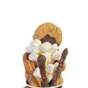 Вафля, сливочное мороженое, маршмеллоу,печенье чокопай, арахисовая паста, топпинг карамель
