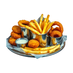 Крылышки острые, сырные палочки, луковые кольца, картофельные дольки, 3 соуса на выбор