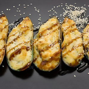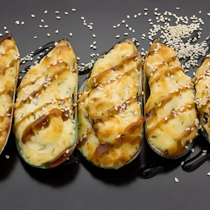 Мидии, фирменная шапочка сырная, соус терияки