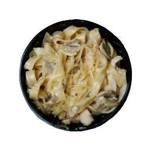 Пшеничная лапша, курица, грибы, лук, чеснок, сливочно-чесночный соус, сыр